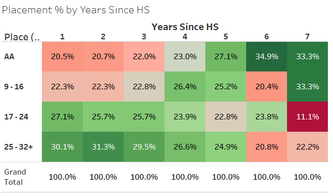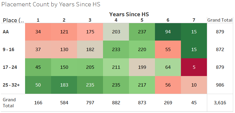 Because there are different numbers of qualifiers for each ‘years since high school’ category I showed the number as percentages of the column above. Below is what the raw numbers look like with the color still based on percentage of the column.