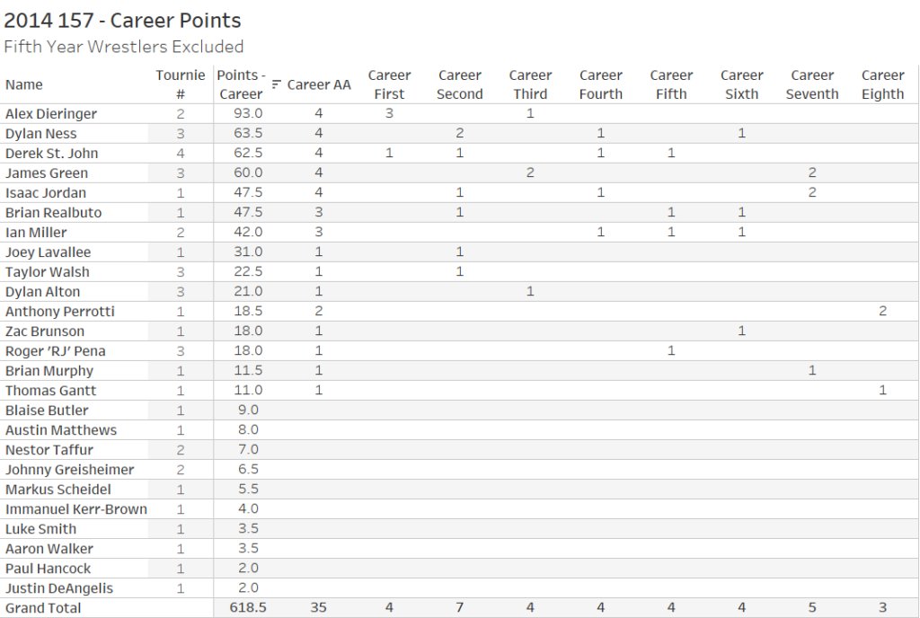 Don’t worry. I have already anticipated your next objection. Is it fair to pad the stats with fifth year guys, especially when using counting stats? If we exclude any bracket that contained a wrestler who wrestled in five tournaments, then we must go back a couple of years to find The One.