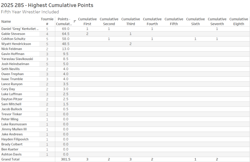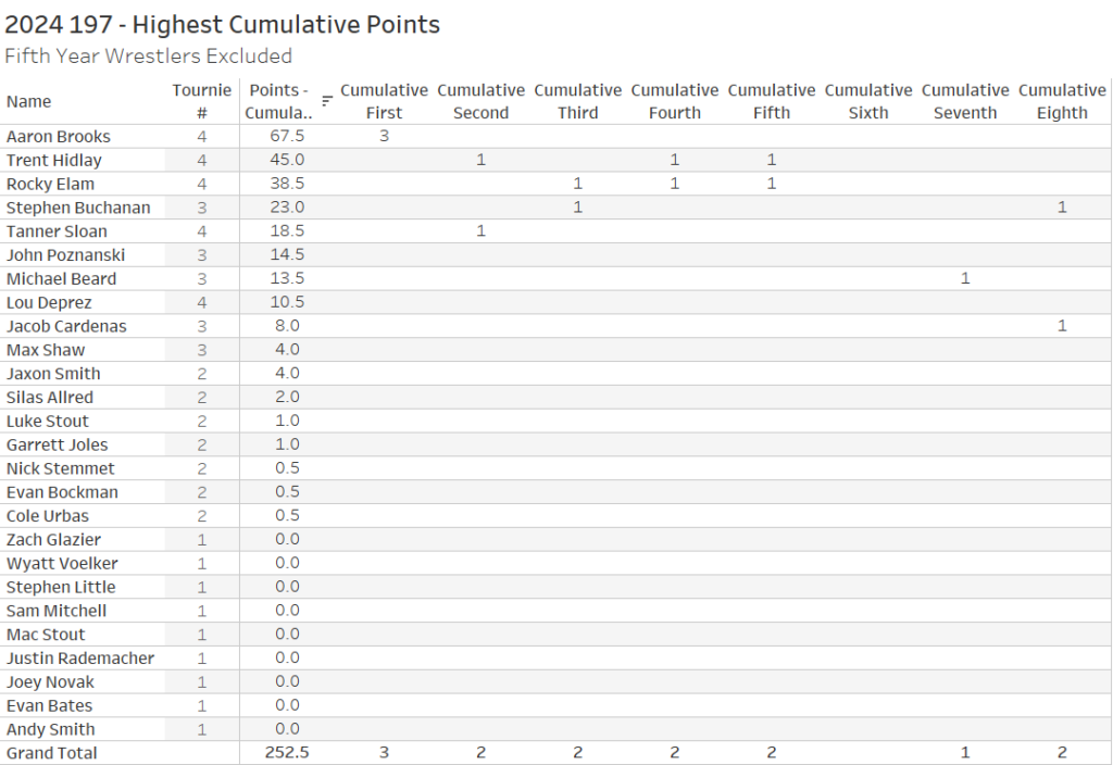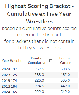 If we believe that the only thing that matters are achievements up to, but not yet including, the bracket in question then we will want to focus on cumulative tournament points per wrestler up to that point in their career. The top 5 brackets for cumulative points were: