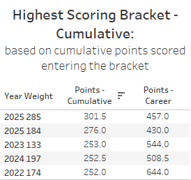 The 2014 157 bracket is still the only bracket from the pre-five times era to outscore the 2008 149 bracket on a career total basis.
