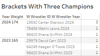 Speaking of Big Bads there have only been two brackets that opened the tournament with three former champions – 2023 165 and 2024 174. And like Stanford wrestling, neither would be possible without Shane Griffith.