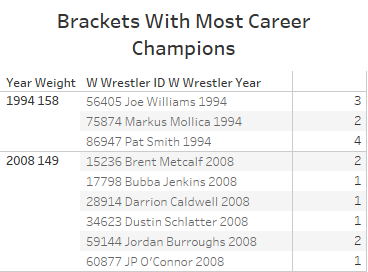 But the 2008 149 bracket does not even hold the record for most eventual championships. That title belongs to the 1994 158 bracket which contained a two-timer, a three-timer, and a four-timer. That is some good work, gentlemen.