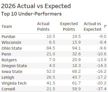 Whisper the question softly, but what happened in the Finger Lakes this year? Cornell put up less than half of their expected points. Unfortunately, this ranks among the worst misses in NCAA tournament history (discussed here – using a slightly different criteria). Virginia Tech, Lehigh, and….well, you can read the rest of the list.
