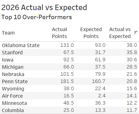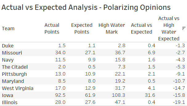The most interesting one to me was Ohio State. A lot of online ink has been spilled over their performance and maybe it is warranted, but this analysis suggests it wasn’t THAT bad. Sure they dropped from expected second to actual fifth, but that has as much, or more, to do with how Oklahoma State, Nebraska, and Iowa over-performed as it does with how the Buckeyes performed.